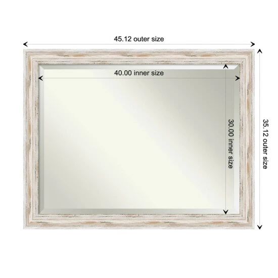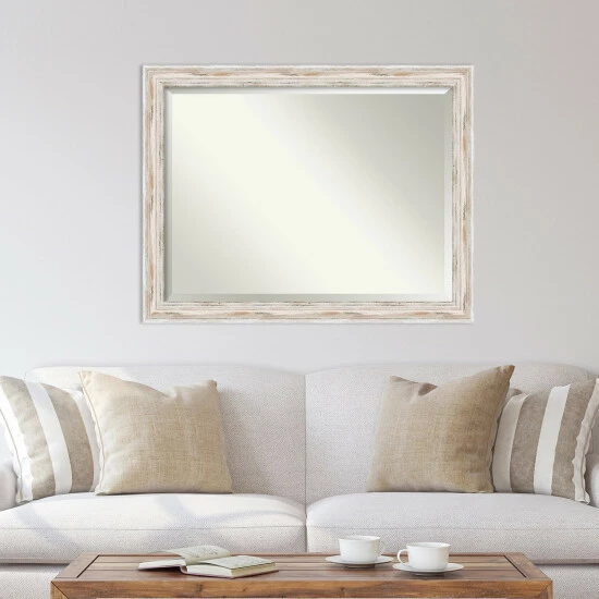 Give your space the finishing touch with this 100% real wood framed mirror. Wall mirrors are a great way to decorate while also bringing light and space into a room. This mirror features a wide, whitewashed frame with outer edge accents. The creamy white finish has tan distressing and weathered patches. This decorative mirror is handmade in a small custom art and frame shop in the American heartland. You can be proud to display it in your home.