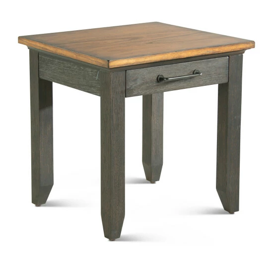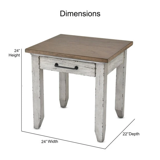 Add the Billings Creek end table to any room needing a little extra storage and a convenient surface for a lamp, display, or your morning coffee. The two-tone rustic ivory and honey or distressed chocolate brown and honey finishes features rub-through and heavy distressing for a casual look that will complement a variety of decors. One drawer for storage is accented by an antique pewter bar-style drawer pull. Β Lightly tapered legs add to the farmhouse appeal. Your purchase includes one (1) end table.