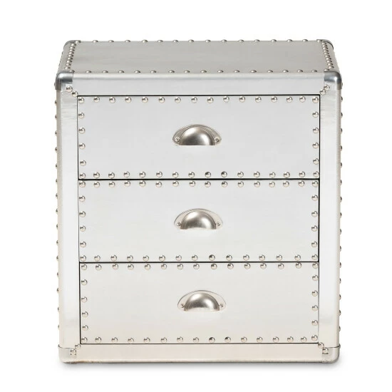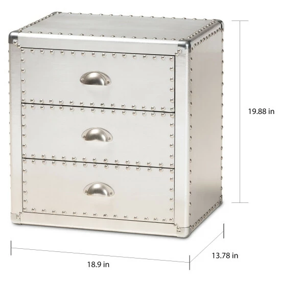Bring classic, convenient storage to your bedside with this industrial-style three-drawer nightstand. Crafted from durable metal with a clean, reclaimed look, this nightstand features riveted detailing and rounded corners for a retro look, and the wide top is spacious enough for a lamp and your bedtime essentials.