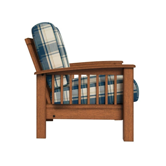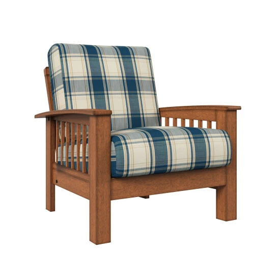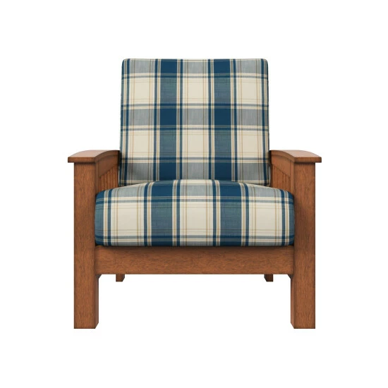 Casual and comfortable, this armchair provides an updated take on mission-style design. The exposed wood frame features a square back and arms in a rich cherry finish. The box-seat cushions are covered in a durable blue plaid woven fabric for lasting style.