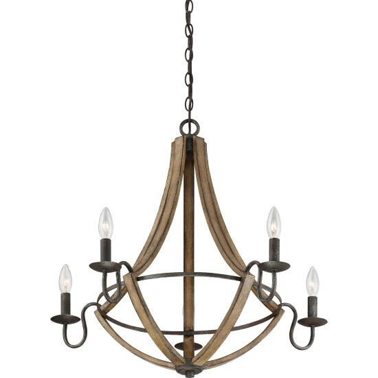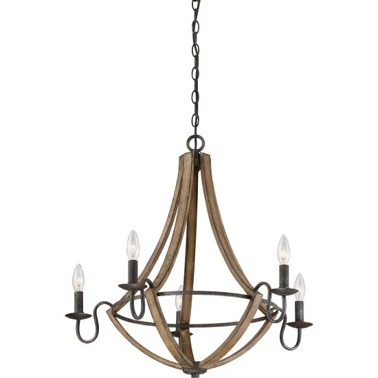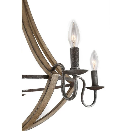 Crafted with industrial minimalism and farmhouse elegance in mind, this chandelier offers the best of both worlds. The rubbed black edges on the faux wood frame complements the rustic black finish of the inner rings. Curved arms and candelabra bulbs add classic charm to the chic simplicity of the drop silhouette.