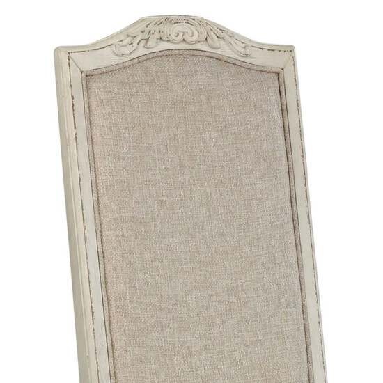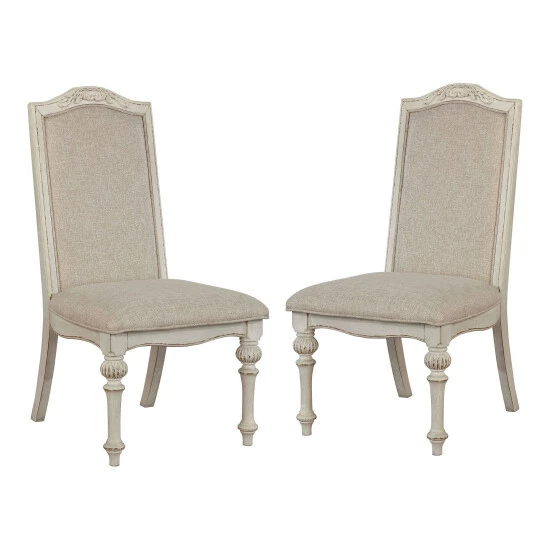 Country manor sophistication is on display in this set of utterly chic side chairs. A touch of distressing in the antique white finish creates the impression of homespun warmth and sophistication, ensuring an inviting yet opulent look you will be proud to show off. The high density foam is a firm cushion that keeps you poised for formal dining.