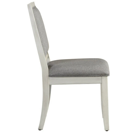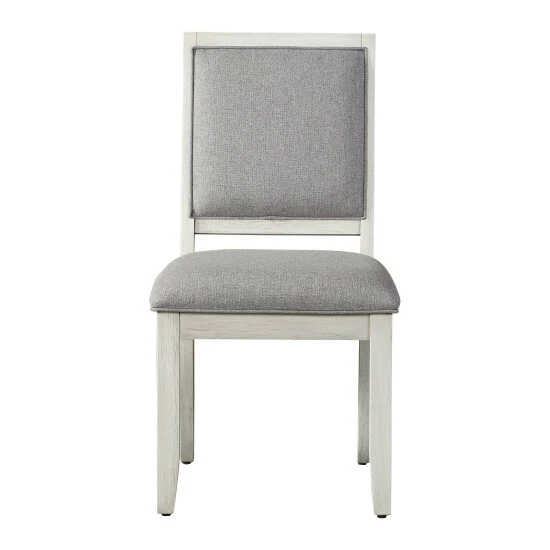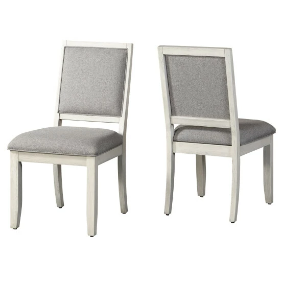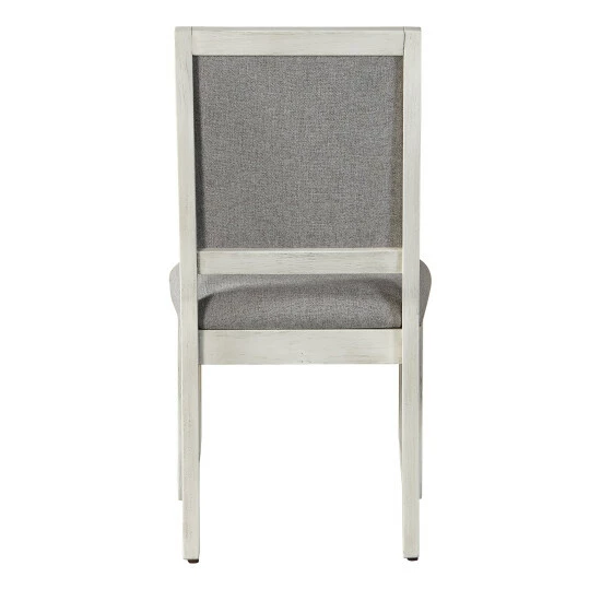 The Cardella Parson dining chair brings style and farmhouse elegance to any setting. A solid hardwood frame is finished in weathered white with gorgeous grey polyester upholstery on the seat and back. Welted seams surround the seat and back with a fabric back inset adding to the eye-catching style.