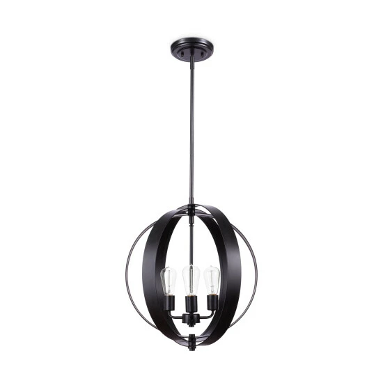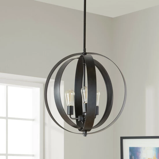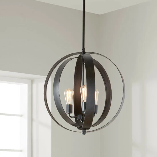 Create a focal point for your dining room with the trendy 3-light Cassidy orb chandelier. Blending modern and retro styles together seamlessly, the three 60-watt Edison lights create classy illumination in an unforgettable style. Three spinning iron rings in an antiqued black finish are suspended from a height-adjustable iron rod base to better accommodate your space.