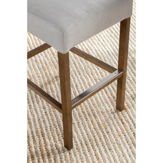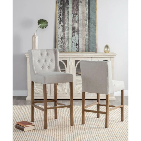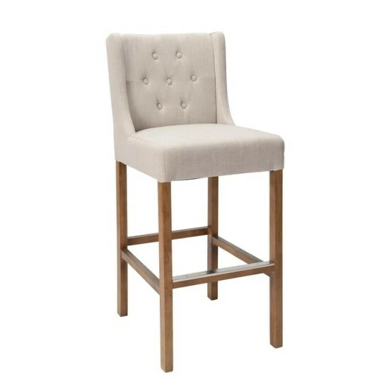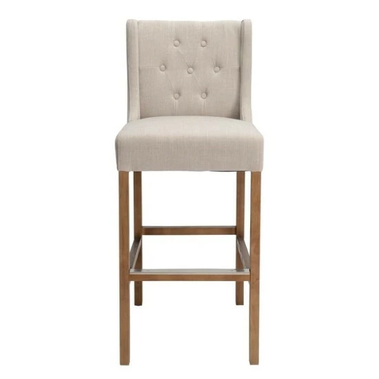 The Barstool is a luxurious seating option with its plush upholstered seating and meticulous styling details. Its button tufting feature adds a sophisticated touch, while the contrasting solid legs bring a country appeal. The stool blends style and comfort, with its metal footrest and neutral hues, making it the perfect addition to any home.