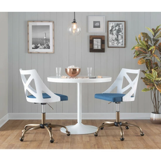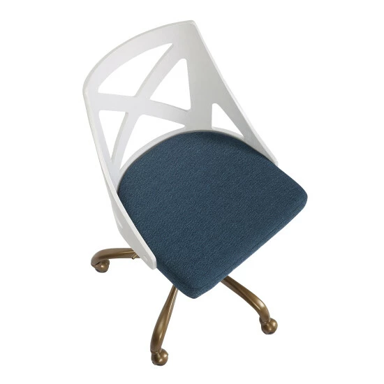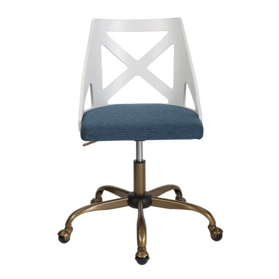 Spruce up your home office with the Charlotte Task Chair. With elegant styling, the backrest shows off an X-shaped accent. Featuring beautiful fabric upholstery, 360-degree swivel, and antique copper base, the Charlotte Task Chair beautifully straddles the line between traditional and farmhouse styles.