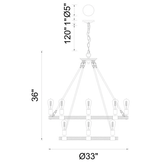 - Dimensions: H 36′ x W 33′ x D 33′ – Black Finish – Requires 14 E26 Bulbs Max 60 W (Sold Separately) – Comes with 120′ of chain – One year warranty against manufacturers defect.