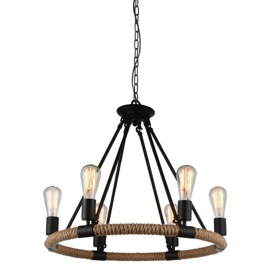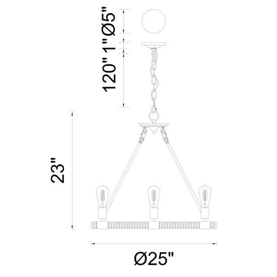 Dimensions: H 23′ x W 25′ x D 25′ – Black Finish – Requires 6 E26 Bulbs Max 60 W (Sold Separately) – Comes with 120′ of chain – One year warranty against manufacturers defect.