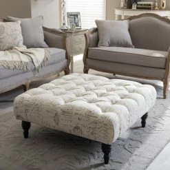 Kick up your kicks with this stylish and comfortable ottoman. Plush polyurethane foam padding makes the ottoman a comfortable spare seat and a luxurious footrest, while the button-tufting and light grey print create a vintage, international feel.