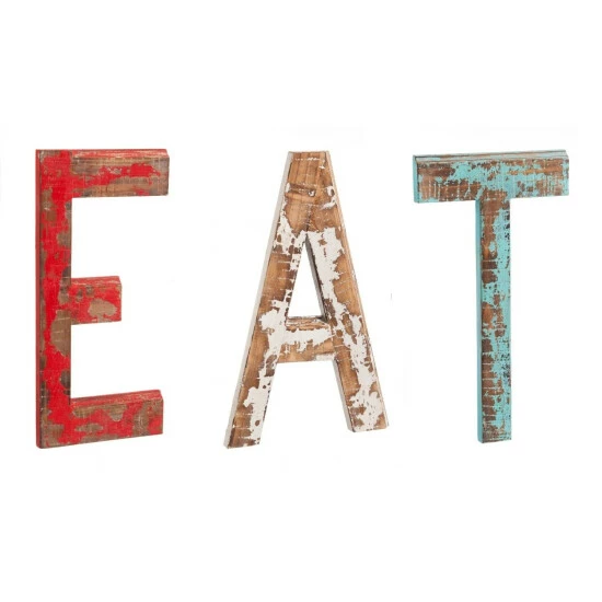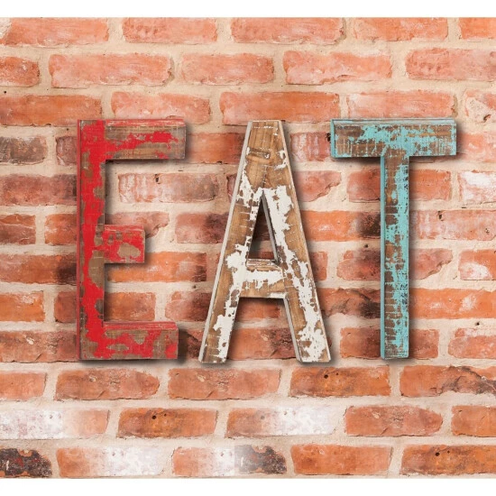 These distressed wood letters spell ‘EAT’ and are a cool piece for a farmhouse or rustic-style kitchen. Fashionable and chic, a great fit for many different types of rooms. Makes a great gift!