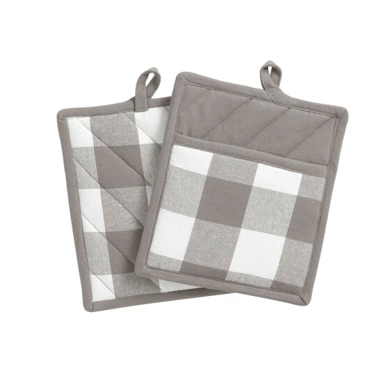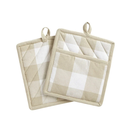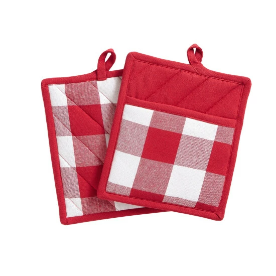Stylish, rustic and beautiful the Emily Gulch Collection offers everything you need to create the shabby chic, modern country home. These fashionable pot holders are made from premium quality cotton and feature the perfect buffalo check pattern in a variety of colors to create the best Farm house look. Excellent for special occasions, events, parties, and everyday decor use. Diagonal stitch and self-piped edge add a finished look and prevent wear and tear. Sold as a pair of pot mitts measuring 8×9 each. Coordinate to all the items in our Emily Gulch collection including tablecloths, napkins, placemats, oven mitts, kitchen towels, kitchen mats and window treatments. 100% cotton. Easy care, machine washable.