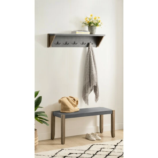 - A natural seagrass, rush bench seat with light amber wood creates a modern mix; coat hook with faux concrete and light amber wood