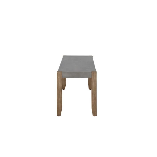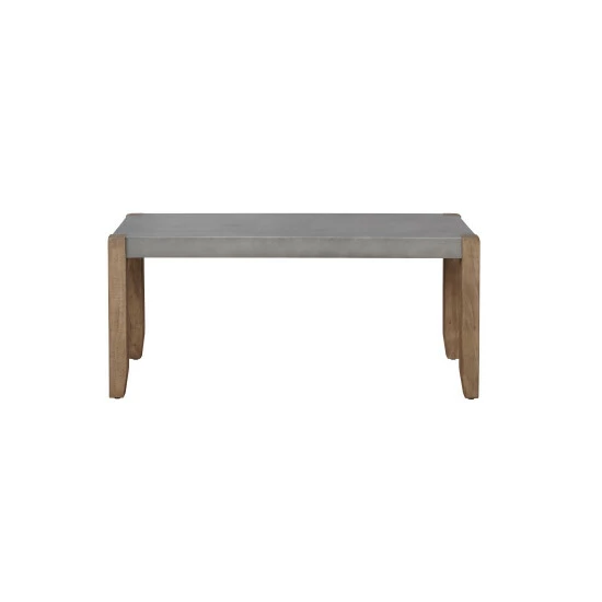 - Faux concrete gray top with light amber wood frame creates a modern mix
