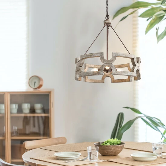Combining striking geometry with a delightful style, this chandelier is a refreshing take on retro splendor. The artful design adds a splash of personality, and the alluring disressed wood finish elevates decor in an instant.