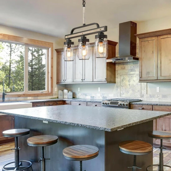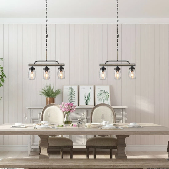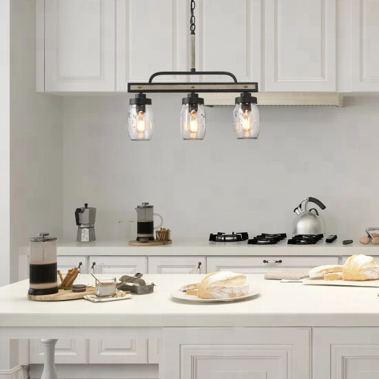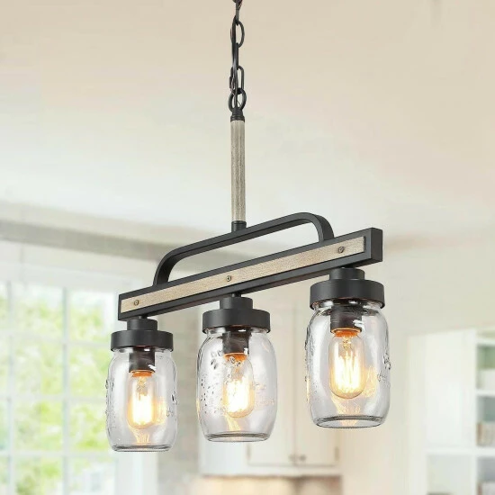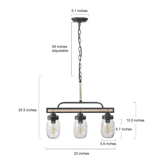 Simple linear chandelier, specially designed to illuminate the heart of your kitchen, dining room, or farm-styled places. Crafted of metal in painting deep gray and rustic faux wood finish, this design features 3 clear Mason jars dropping down from the wood to look linear base. this rustic pendant light can be adjusted from 26.5′ to 85.5′ without using any additional tools or parts. This kitchen pendant lighting is compatible with all ceiling types including flat, sloped, slanted, and vaulted ceilings. This dining room hanging lighting fixture works with a compatible dimmer switch (Not Included) and requires 3 x E26 Base max 40W Bulbs (Not Included).