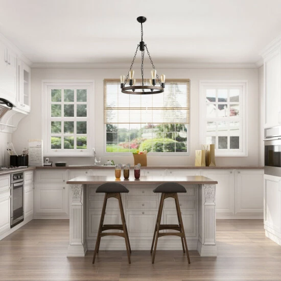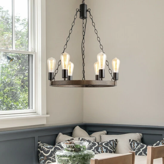 - FAUX WOOD DESIGN FOR VARIOUS CEILING: Finished in a faux wood way, this chandelier can be hanged in entryway, dining room, living room, foyer, or bedroom. Compatible with flat, sloped, slanted or vaulted ceilings.