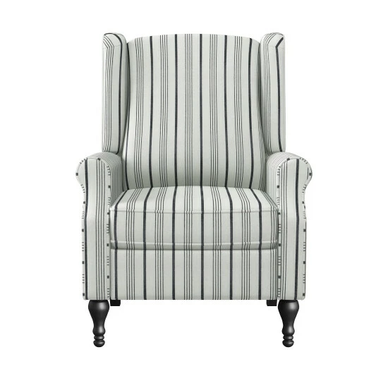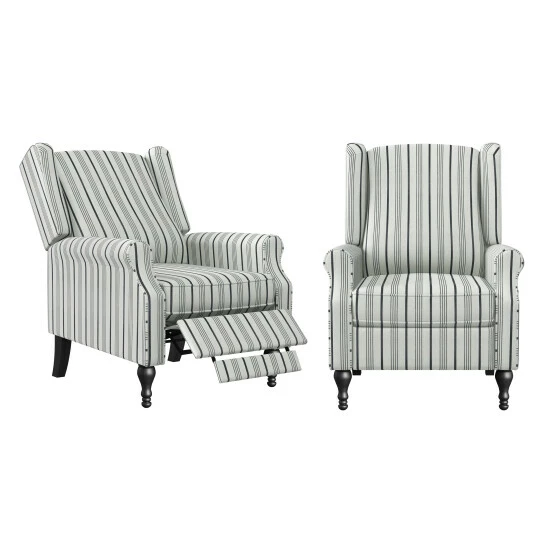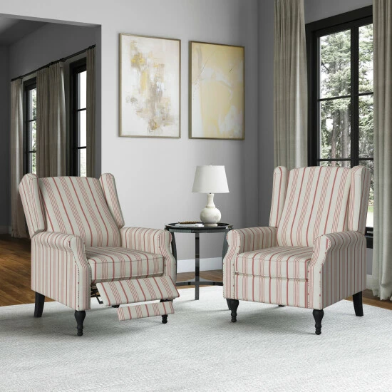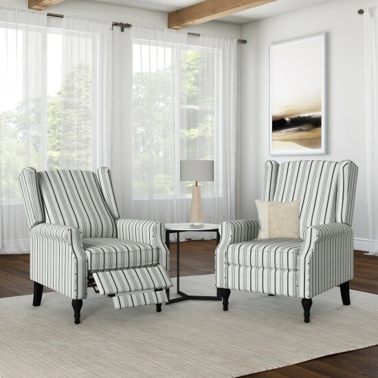 Upholstered in a linen farmhouse-inspired woven fabric, this set of 2 classic pushback recliners offer an updated take on the traditional wingback armchair. Simply push back to recline, no levers or buttons required for comfortable long term sitting, TV viewing or a relaxed recline.