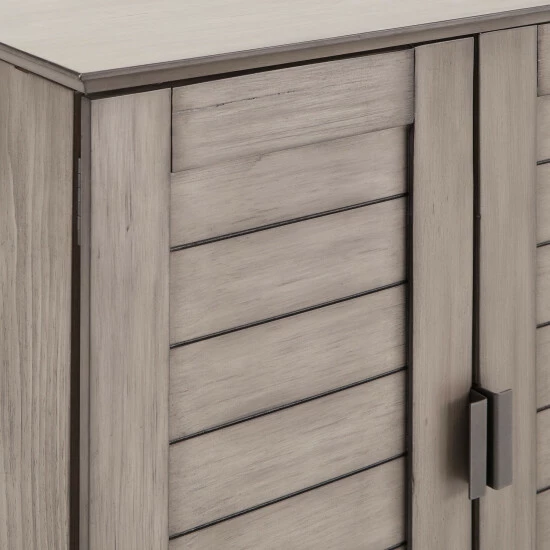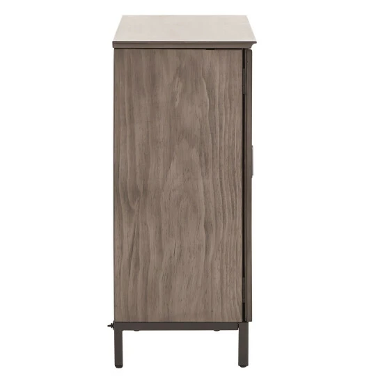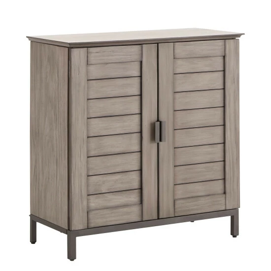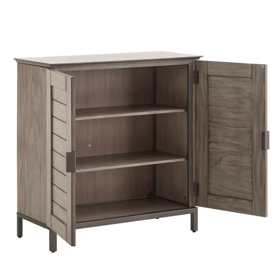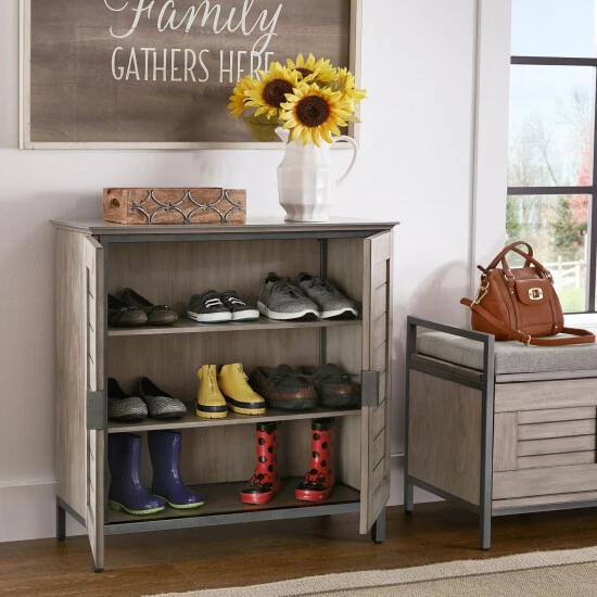 A rustic grey veneer surface is paired perfectly with the black metal base and door handles, making this cabinet the perfect addition to a farmhouse themed home. Place in the entryway of your home, this wood paneled cabinet opens to reveal two interior adjustable shelves, perfect for organizing the footwear of your entire family.