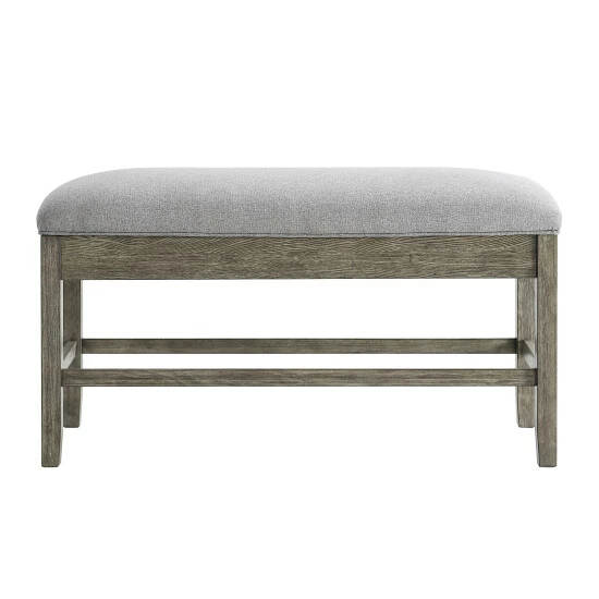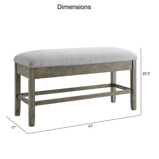 The plump cushion and convenient storage make this counter bench a smart seating solution for your dining room. The driftwood finish highlights the natural wood grain giving it a rustic casual vibe, while the comfortable seat is upholstered in Ash grey polyester for easy cleaning. The seat lifts up and offers storage for placemats, napkins, or other dining essentials. Β