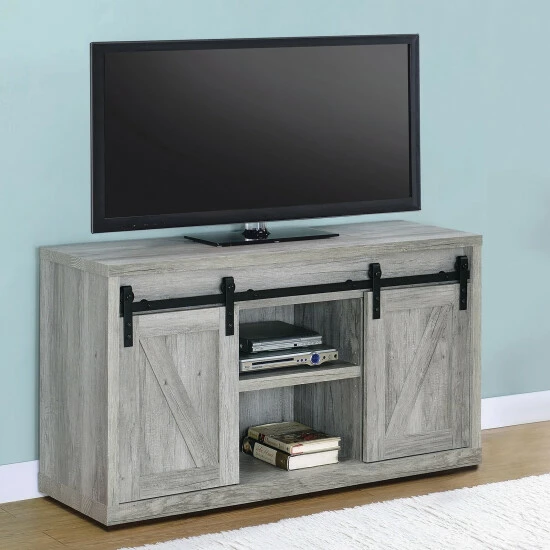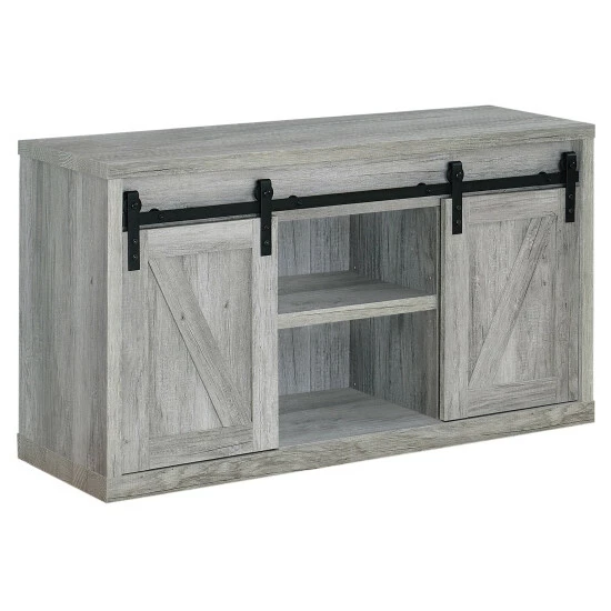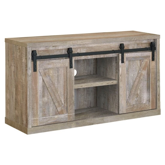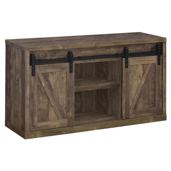 Bring a little farmhouse charm into your space with the rustic allure of this TV console. The attractive barn doors slide aside, allowing you to tuck away electronics and other essentials for a positively pretty entertainment center you will be proud to show off.