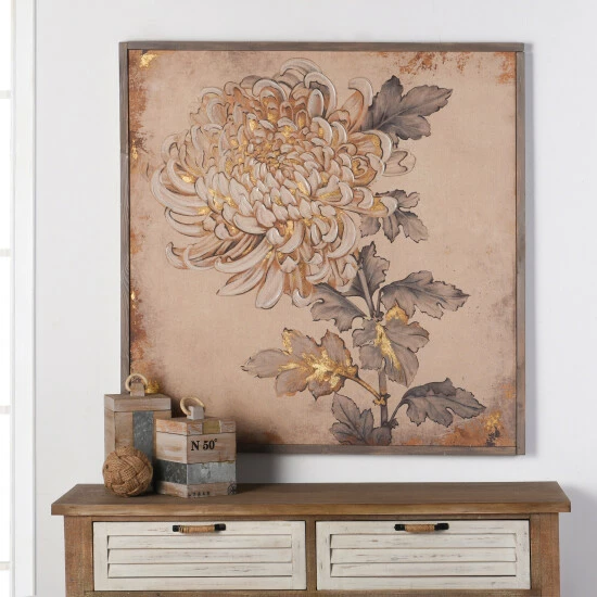 The utter charm of Bohemian flair and chic nostalgia is on display in this lovely and welcoming canvas. This delightful floral linen print is custom stretched and hand embellished for your viewing enjoyment.