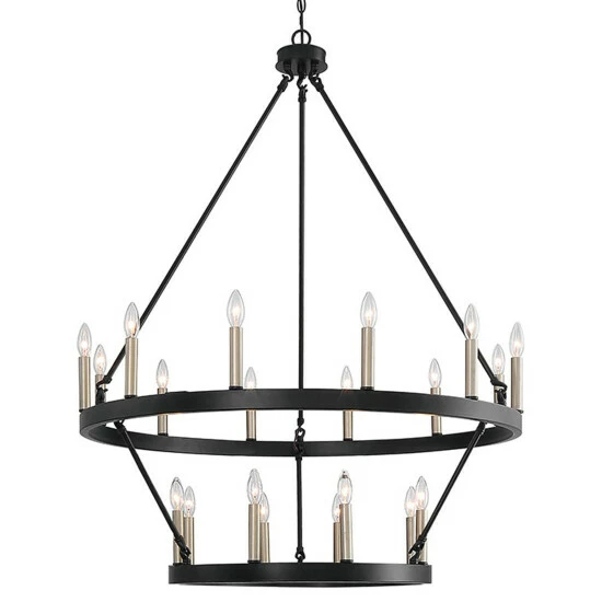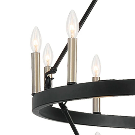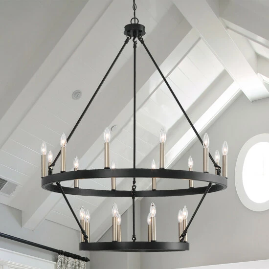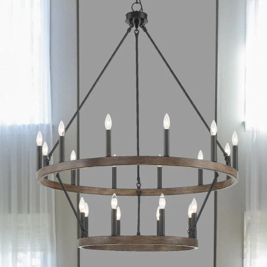 The perfect pick for modern farmhouse arrangements. A rustic silhouette gets a contemporary refresh with this wagon wheel chandelier, this fixture features two rings suspended by slender downrods and a sloped-ceiling-compatible canopy. Chandeliers are famed for their ability to elevate a space with their many lights and elaborate fixtures, and this piece delivers just that with on-trend industrial inspiration. this piece features a two-tiered wagon wheel. Ideal for washing a room in light, this piece also features interlocking chains for an additional industrial-inspired touch. this 20 lights chandelier is perfectly proportioned to hang in larger rooms.Β