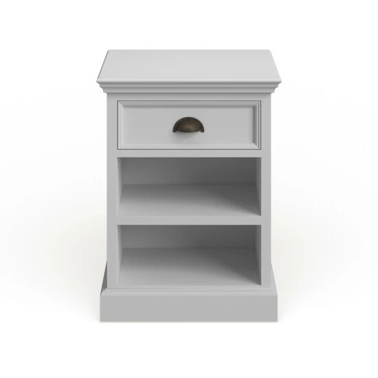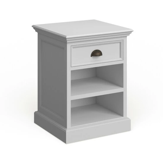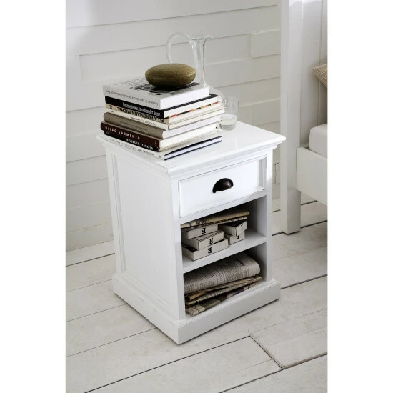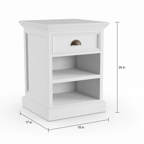 With a contemporary style and chic white finish, this Idlewild accent table is a wonderful addition to any bedroom. This lovely piece features crown moulding and antique-brass hardware for added charm. A smooth top offers ample room for a small lamp, while a spacious drawer and lower shelf provide an ideal amount of space for your night time essentials.