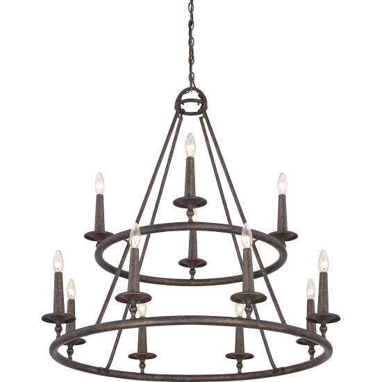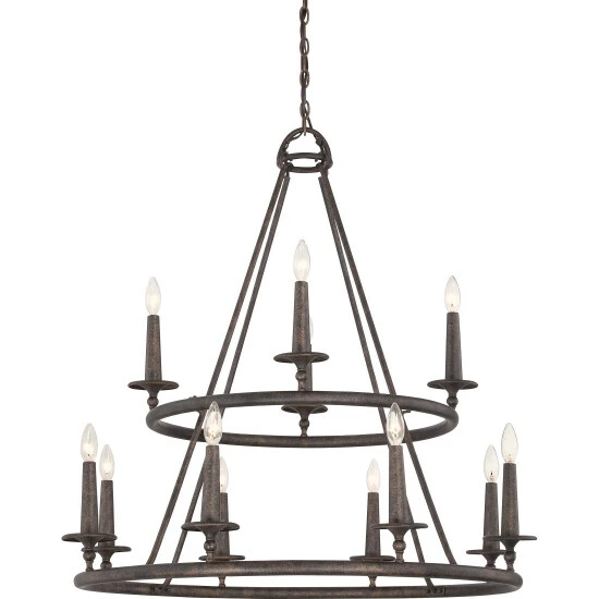 Elevate your rustic decor with this stacked steel chandelier. The Gothic-inspired design features two tiers, finished in distressed bronze to match your unique decor. 12 classic candelabra bulbs decorate the sturdy frame to illuminate your dining room or entryway.