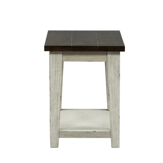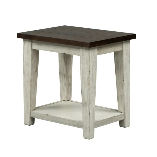 Elevate your rustic style space with the Lancaster chair side table. Crafted of poplar solids with acacia and birch veneers, this piece features an antique white with rub through finish on the base and a weathered bark finish with white hang up on the top, a bottom shelf for additional storage and is anchored by tapered legs. This contemporary side table, with the two-tone finish creating a casual appeal, would make a gorgeous addition to your rustic styled home.