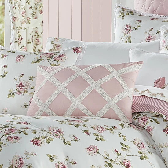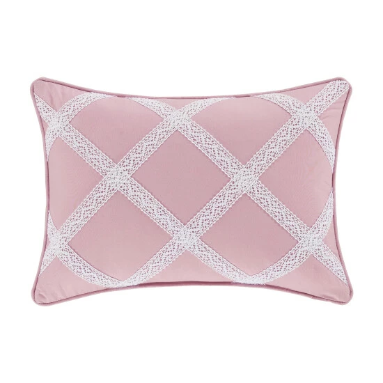 Presenting a take on a true classic, this farmhouse throw pillow is simple and elegant in pink and white with lace details. This pillow is the perfect match to a refined space.