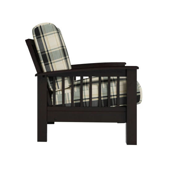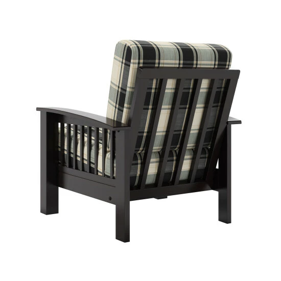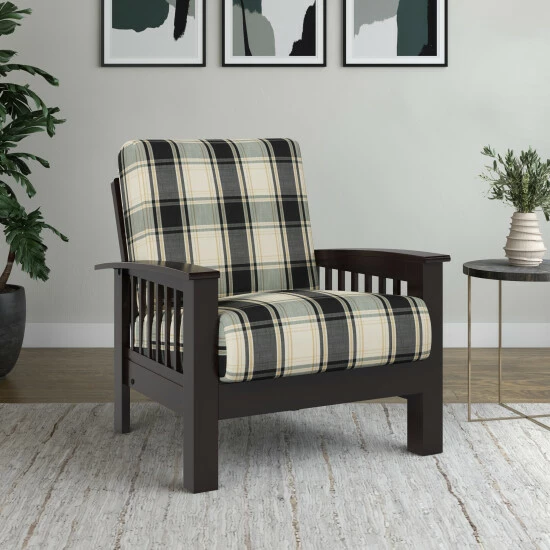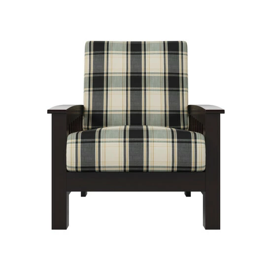 Create a relaxing living space with this casual plaid arm chair from The Gray Barn. The espresso-finished exposed wood frame features slatted arms and is finished in a dark espresso. The removable box style cushions are filled with foam and add to the overall look.