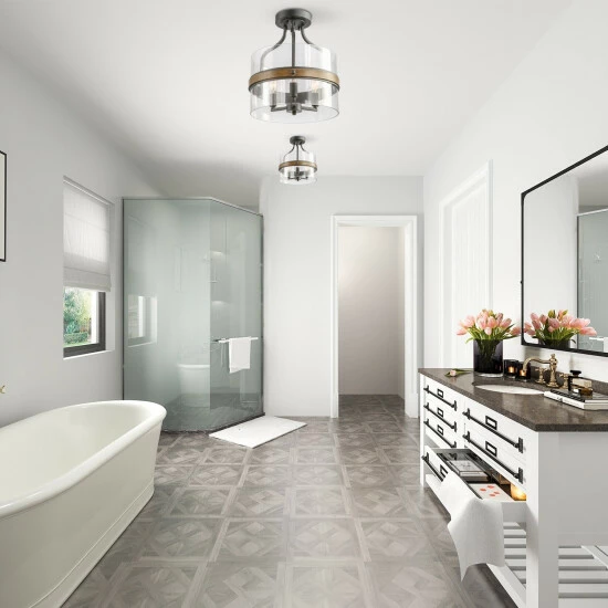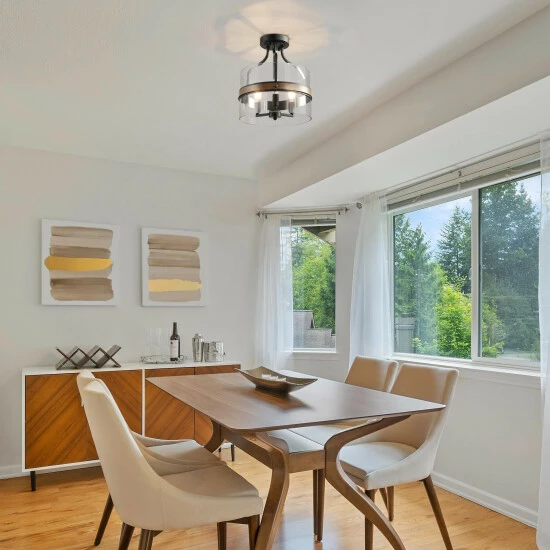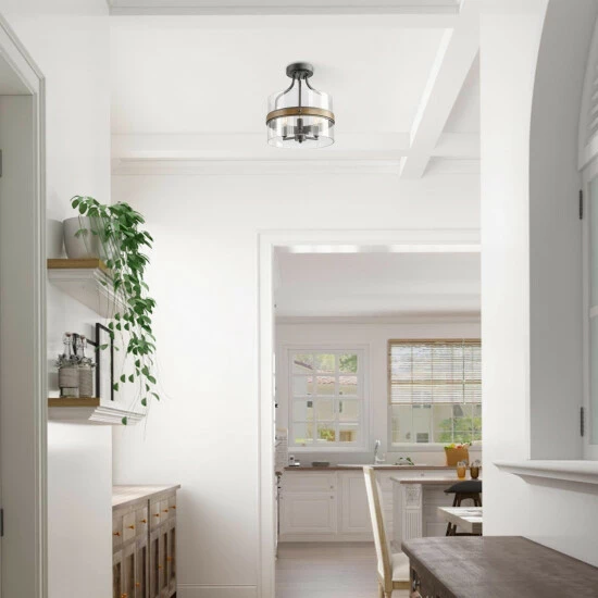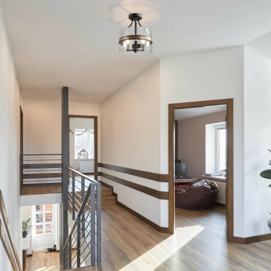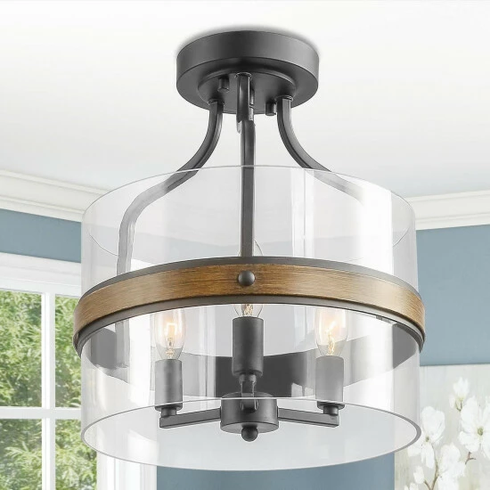Gracefully and delicately proportioned, this semi-flush ceiling light updates classic style with its black and faux-wood metal finishes along with clear glass drum-shaped design centered by an external beautiful metal ring to hold its modern design. It carries 3 candle shaped lights allowing it to shine in traditional and transitional rooms. Three metal curved arms holding the drum pairs modern and industrial style for a ceiling light with designer appeal. Its standard size makes it suitable for most places creating endless beauty whether hanged in dining room, over Kitchen Island, in living room, bedrooms, foyer, doorway or any other place.