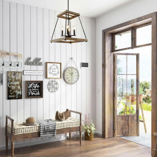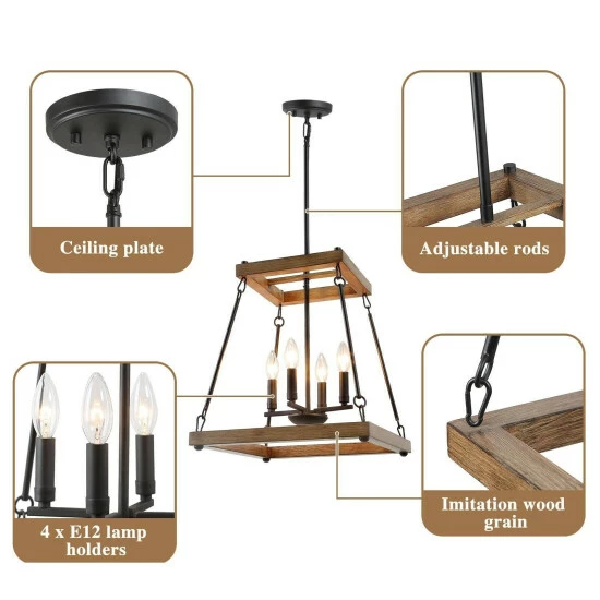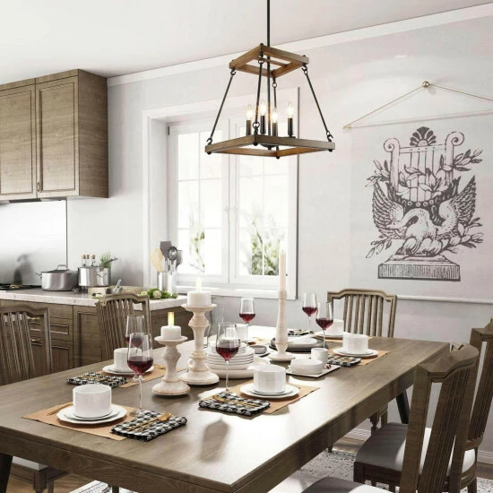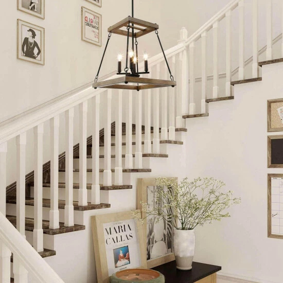 Using the Rustic finishes of natural wood, this unique trapezoid chandelier creates a farmhouse, on-trend look that will be the perfect statement piece in your foyer or over your kitchen island. Inside the open cage is a mini chandelier using four max 40W candelabra bulbs that will create the perfect ambiance for your favorite space.Β