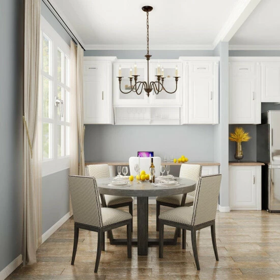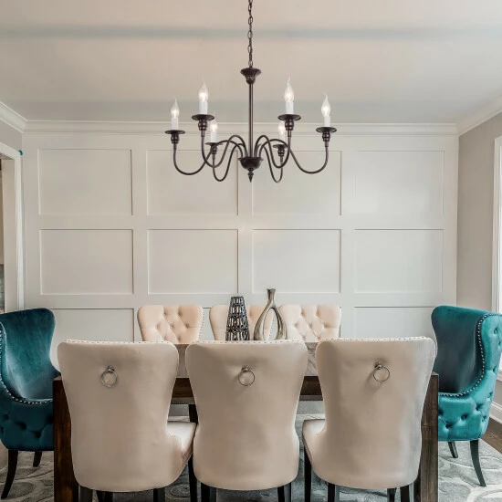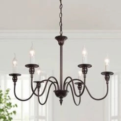 With a timeless appeal this 6-light chandelier will elegantly complements any interior. 50″ chain mounted chandelier can add visual interest to foyer or cast a welcoming glow over your dining table. The six candelabra lights add plenty of illumination with the use of 40 watt candelabra bulbs. Oil rubbed-brown finish, 6 candle-shaped bulb stems with dish cups, placed on 6 simply curved iron arms. It is perfectly designed to fit your ceiling whether for dining room, living room, foyer or any other place!