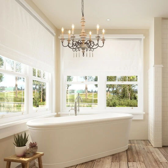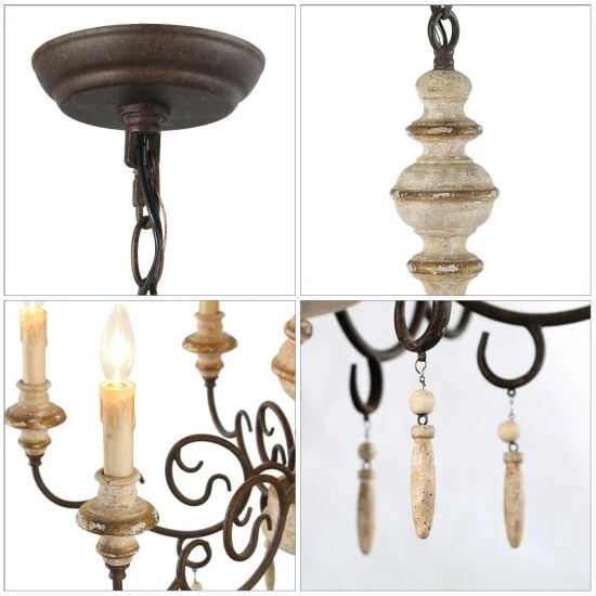 Defined by its classic candle-style silhouette, this six-light french Β country chandelier brings elegant appeal to your home. Six curving rusty iron arms radiating from a spindle-shaped wood body in a antique white finish, and traditional candle covers create a vintage-look Β chandelier. The neutral color of its wooden frame is easily matched with many different Β color schemes. Β