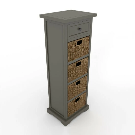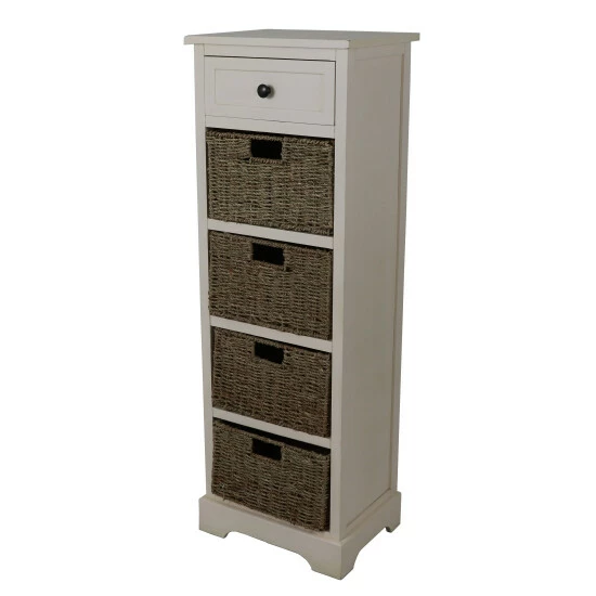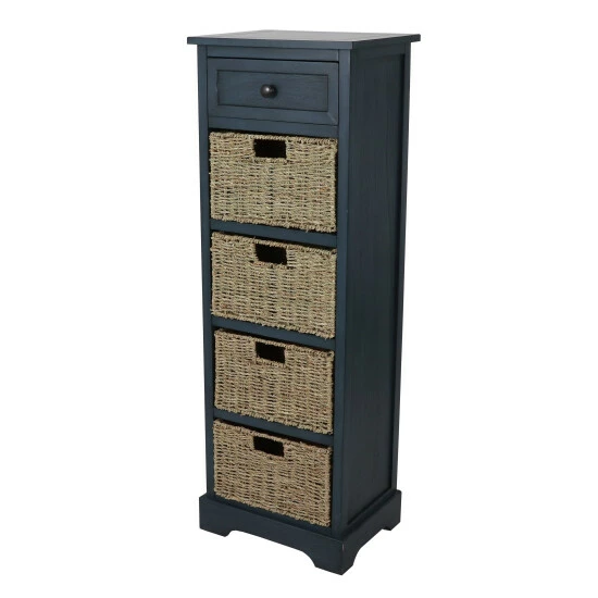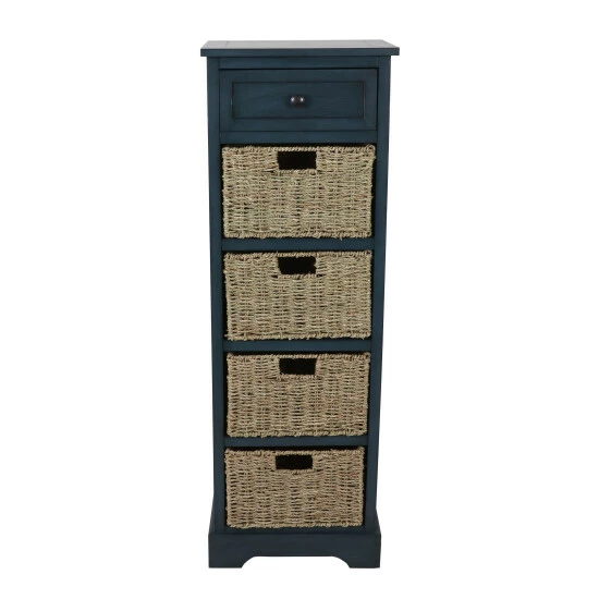 Inspired by the effortless style of the farmhouse aesthetic, this accent table is warm, attractive, and useful. Use it showcase a table lamp next to your sofa, set it next to the bed in the guest room, or add organization to your home office. Equipped with a top wooden drawer and 4 woven baskets to provide ample storage space for your knick knacks. The chest is available in multiple finishes and is constructed of durable solids and MDF.