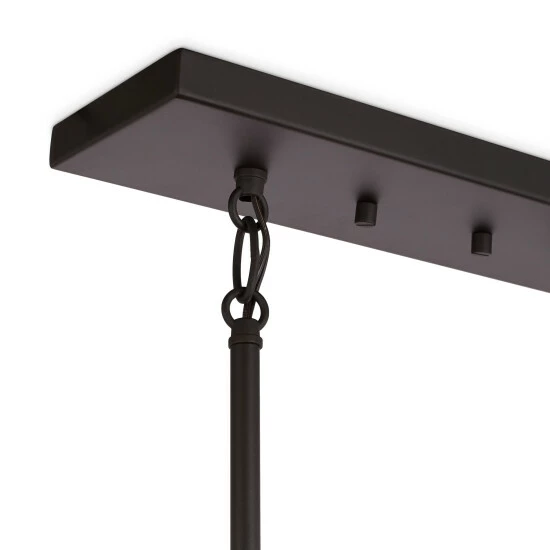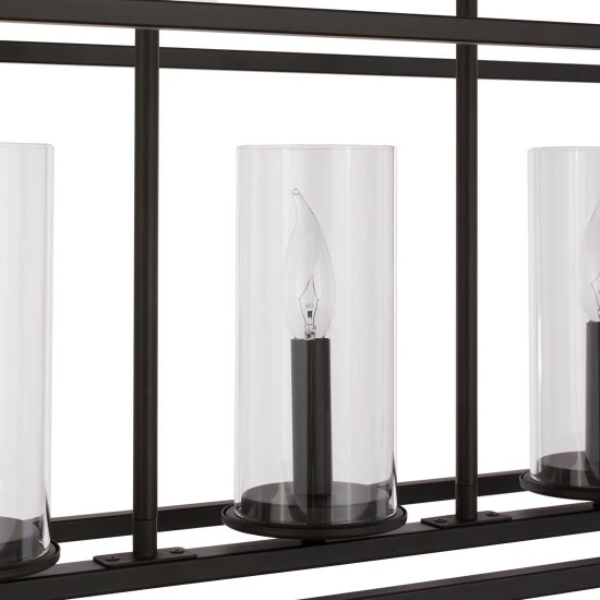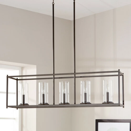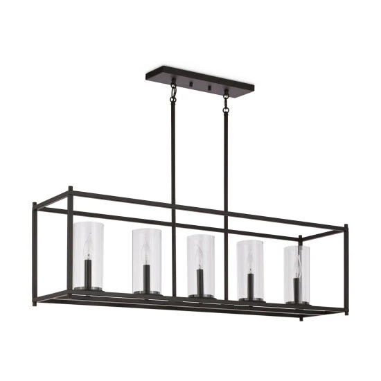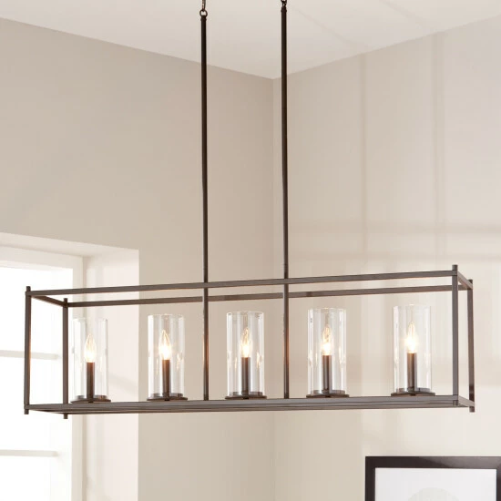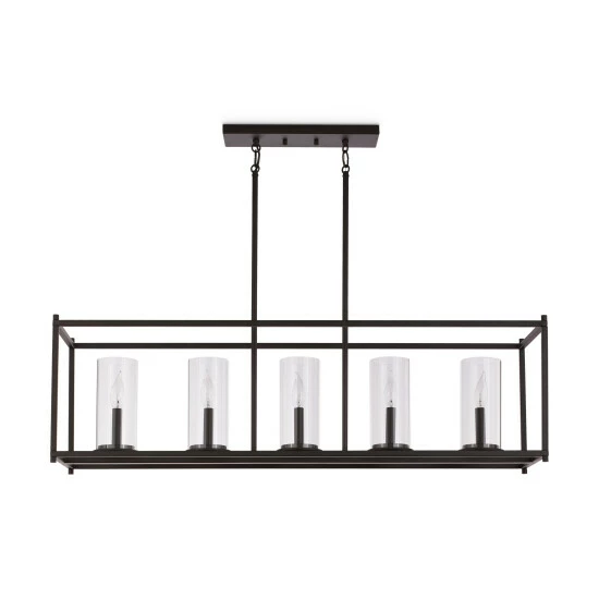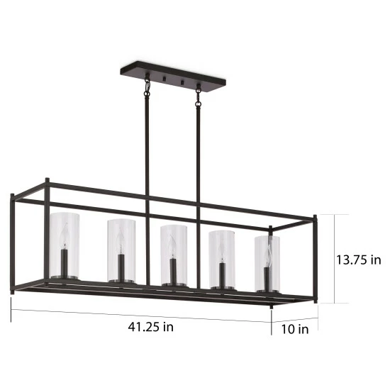 Up the modern elegance in your home with this chic and contemporary five-light chandelier. With cylindrical, clear glass shades, this chandelier makes a statement with its open, rectangular frame finished in bronze.
