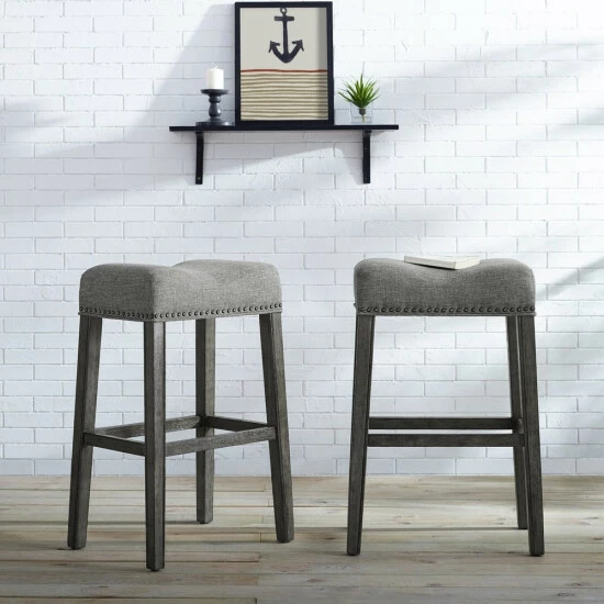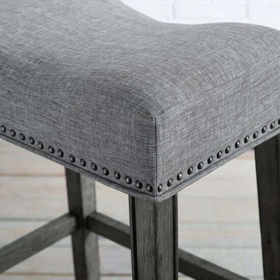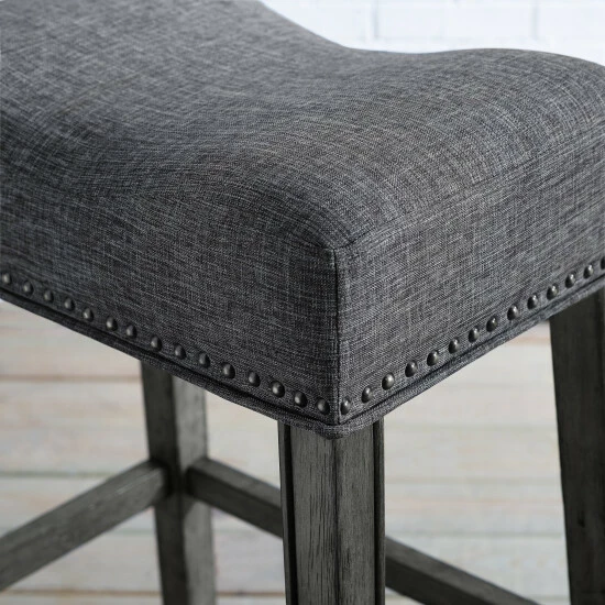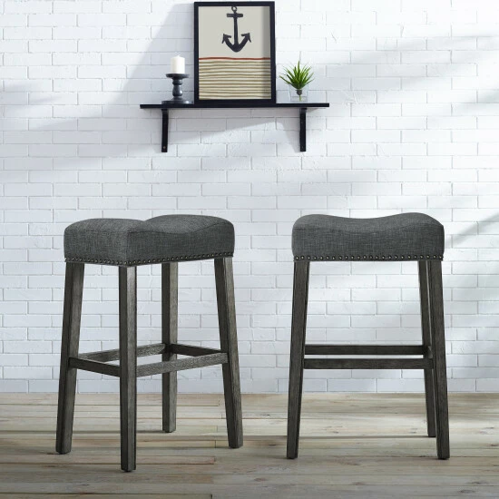 Bring a little French country chic into your home with this deluxe set of charming saddle seat bar stools. The plush seat is highlighted with a nailhead trim for a touch of traditional refinement sure to be enjoyed for years to come. The bar stools have a weathered wood grain finish with a saddle seat design and is available in three different color options.