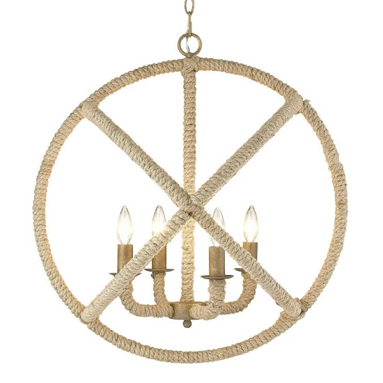Nautical flair meets rustic pizzazz in this burnished chestnut four-light chandelier. Featuring authentic rope wrapped around a circular steel frame, this unique chandelier is a standout addition to your home decor.