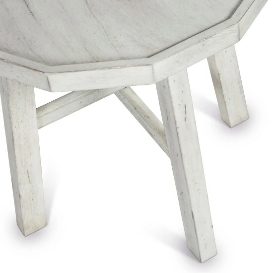 A perfect choice to highlight your modern farmhouse décor, this unique shaped end table features a distressed alabaster finish, tray style top, and wood plank legs supported by double X-stretchers and a metal center support. The perfect complement to your favorite living room chair.