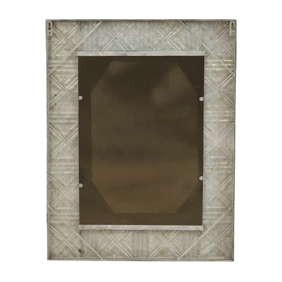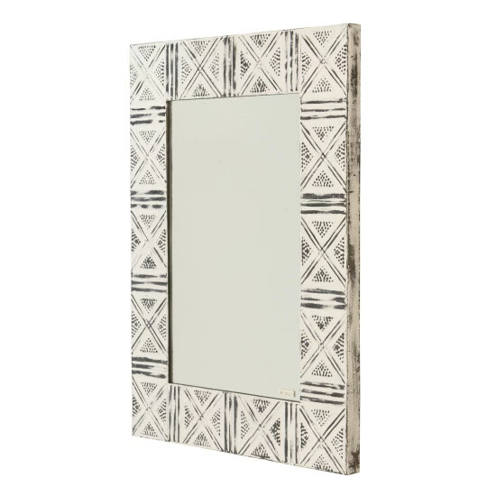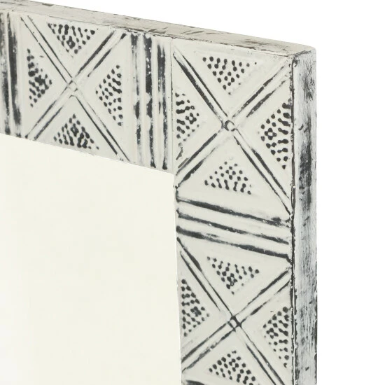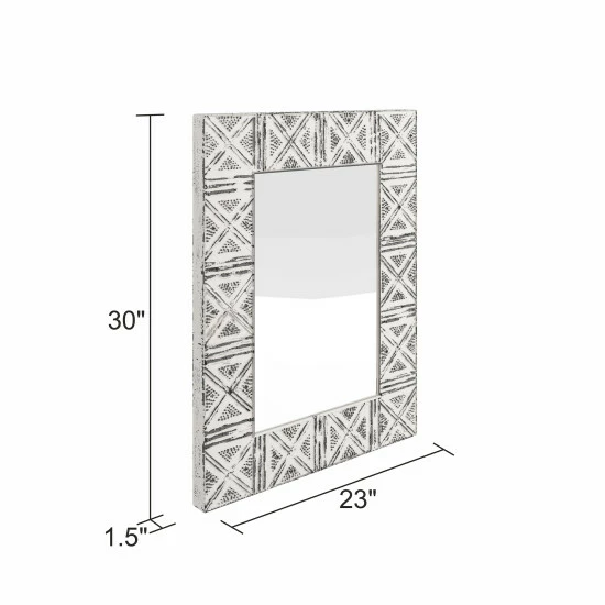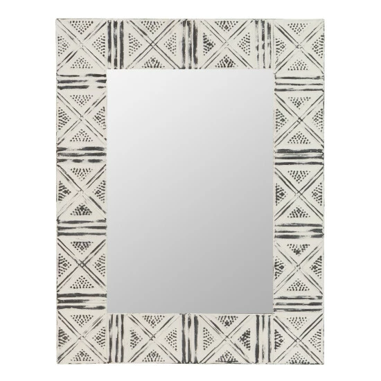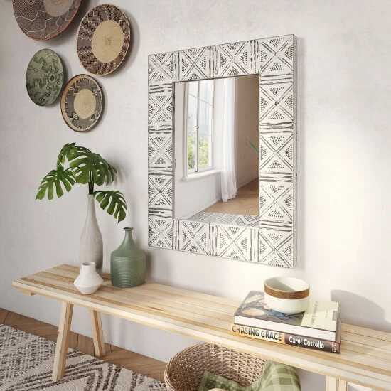 Taking a style cue from Bohemian-modern to farmhouse-rustic, this wall mirror shows off a metallic frame adorned with a dramatic, geometrically inspired pattern. A distressed white and grey finish gives it a gently aged look, and you can hang it horizontally or vertically.