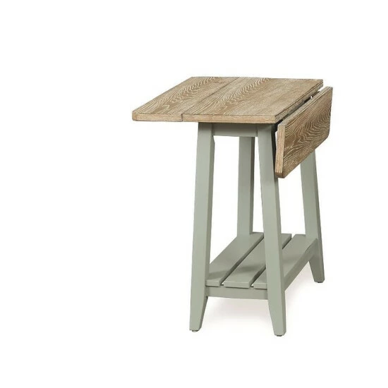 The farmhouse style of this drop-leaf end table is the perfect addition to many home decor settings. The table is expertly-crafted from solid poplar wood with oak and birch veneers. The rounded edge profile creates a soft design and the sides fold down for versatile use. The plank design on the lower shelf is perfect for displaying your favorite picture or plant.