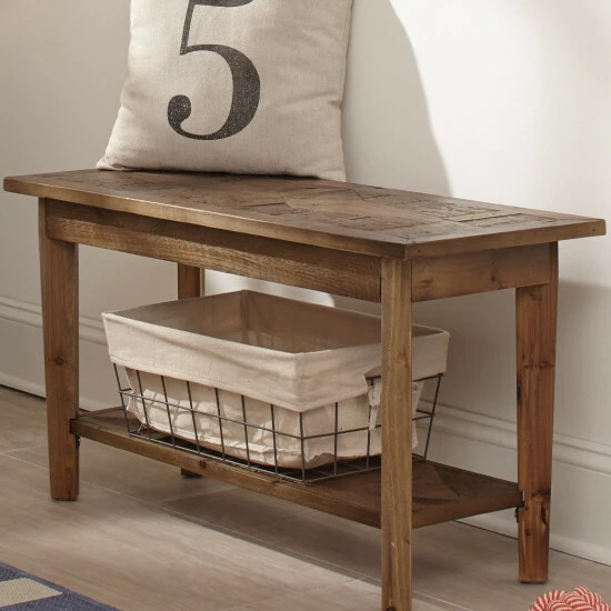 Achieve a more organized look in your entryway while boosting the rustic charm of your space with this storage coat hook and bench set. Hang coats, jackets, and accessories while adding a personal touch with your favorite decorative pieces arranged on the shelf of the piece. Sit on the bench to dress and undress for outdoors with ease and convenience.