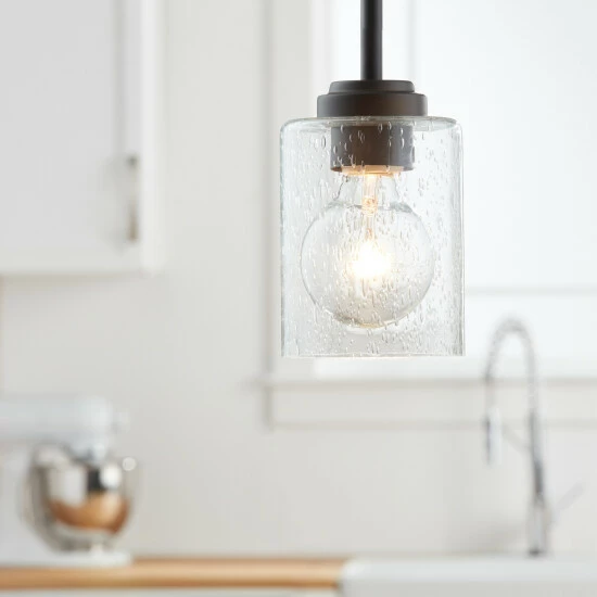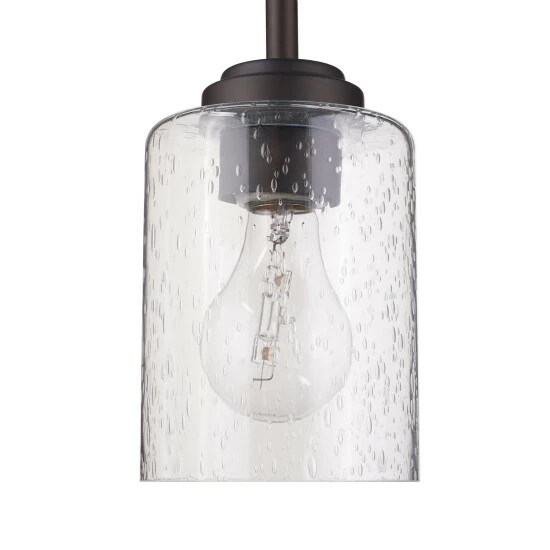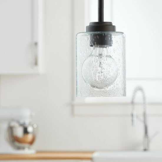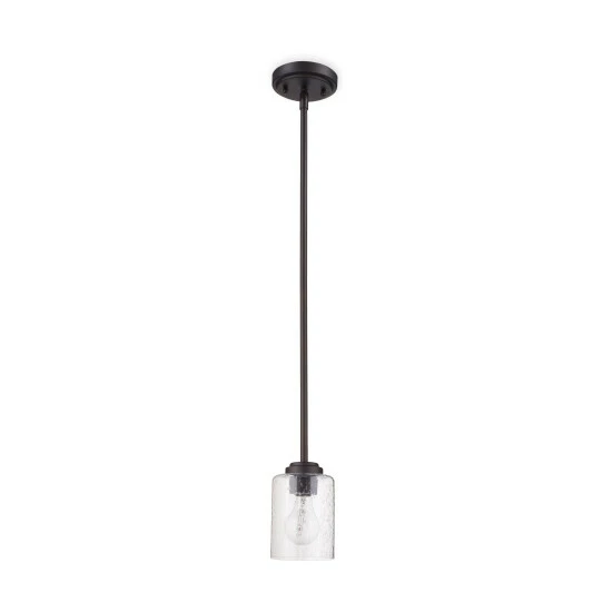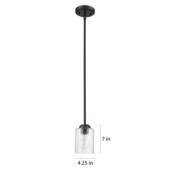 This 1-light mini pendant features an olde bronze finish that will complement many transitional decors. The clear seeded glass shade allows the light to bounce in different ways giving a unique look for any space and completing this simple yet functional design.