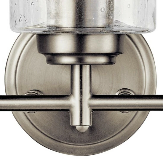 This 3-light bath/vanity light features a brushed nickel finish that will complement many transitional decors. Clean lines of the steel frame add interest while the clear seeded glass shades allow the light to bounce in different ways giving a unique look for any bathroom or vanity space.