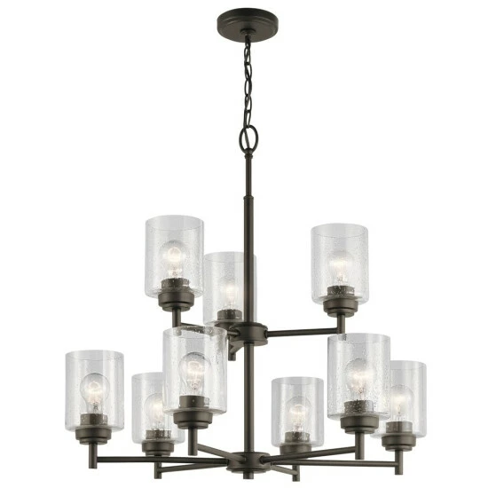 This 9-light, 2-tier chandelier features an olde bronze finish that will complement many transitional decors. The clean lines of the steel frame add interest while the clear seeded glass shade allows the light to bounce in different ways giving a unique look for any space.
