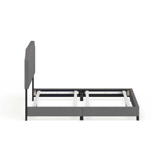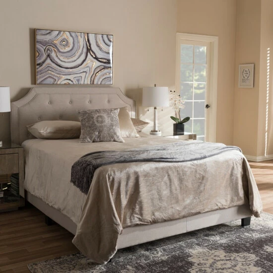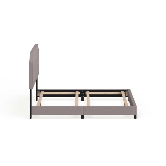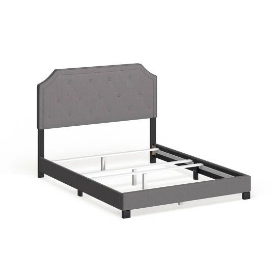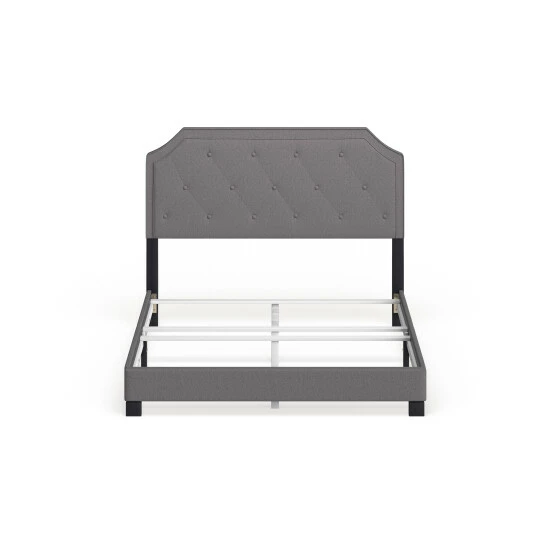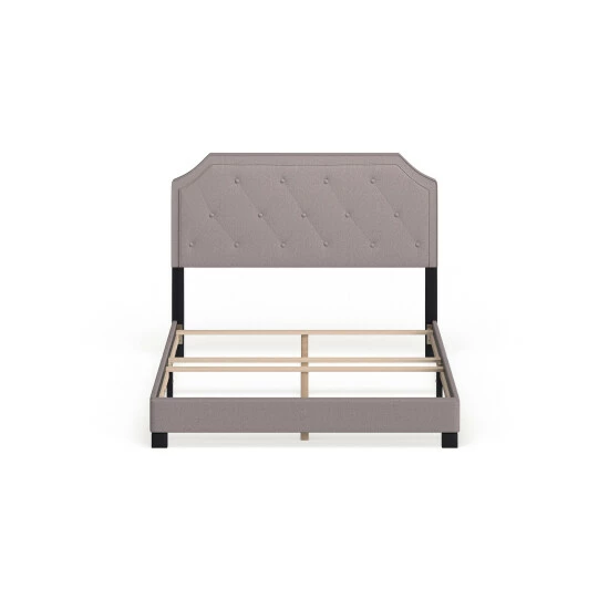 Exquisitely crafted from rubberwood, MDF, and particle board, this charming Whitegrit bed from The Gray Barn will modernize the comfort of your room. The attractive bed set includes an upholstered base, and a cut-out shoulder headboard with ribbed detailing and diamond stitching with button tufting. The trendy bed comes in full, queen, or king size, with polyester fabric upholstery, available in light beige or light grey.
