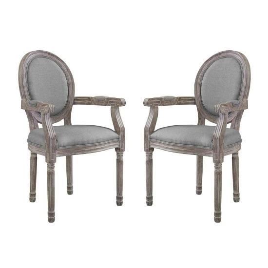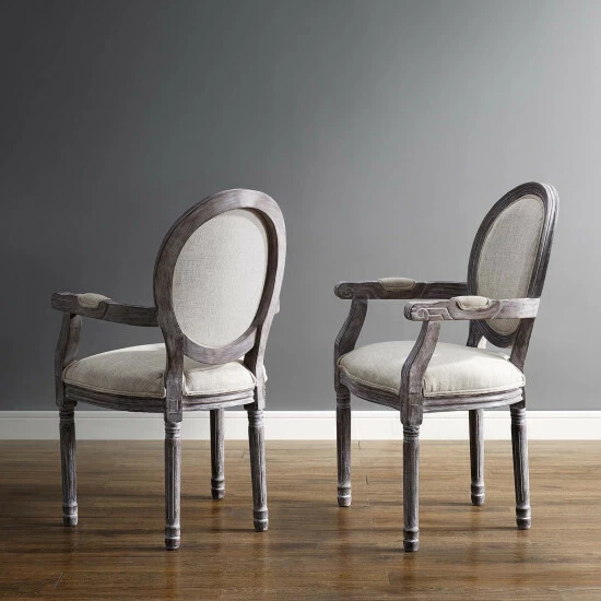 Revel in the whispered opulence of this Dining Armchair. Featuring a fluted wood frame, dense foam upholstered fabric seat and scooped armrests, this oval back dining or accent chair elegantly blends old world charm with modern intrigue. Designed with a weathered vintage French look and an undeniable appeal, the chair supports up to 331 pounds and comes with foot pads to preserve flooring. Comes fully assembled.