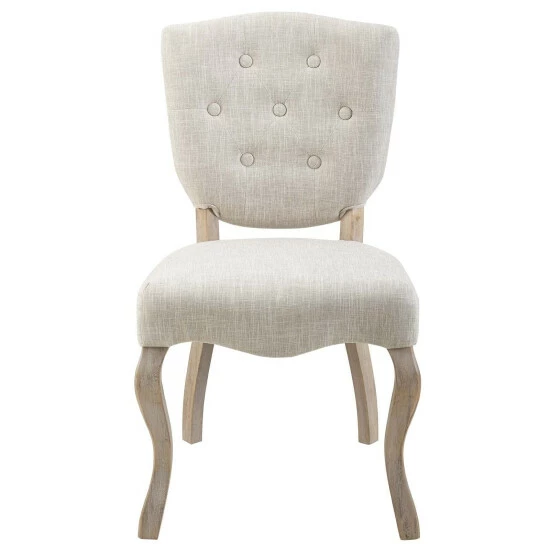 Usher forth a harmonious dining environment with this side chair set. Four saber-shaped weathered wood legs develop a sculptured silhouette, while the shield back with button tufting displays hints of opulence. Complete with a generously padded seat, and soft polyester upholstery, Array comes with non-marking foot caps to preserve floor integrity, supports up to 331 pounds, and does not require assembly.