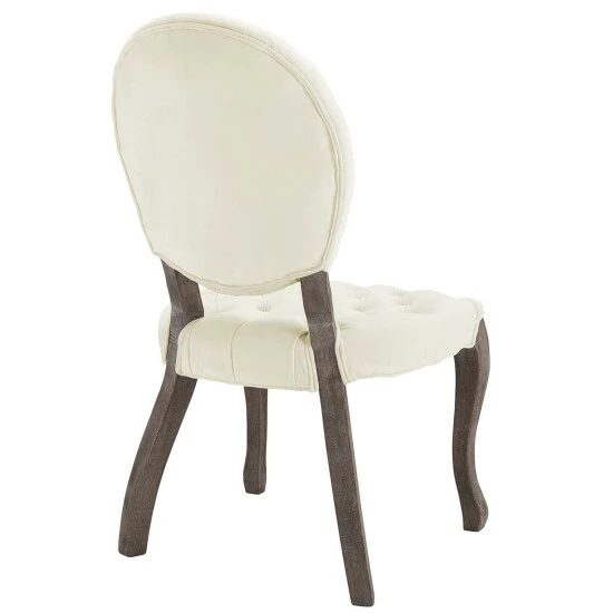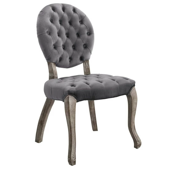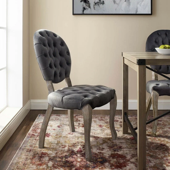 Welcome Parisian elegance with this French Vintage Performance Velvet Dining Side Chair. Elegantly designed with deep-button tufting, a round seat back, weathered wood cabriole legs with chiseled artisan detail, this chair makes a beautiful addition around the dining room table, in front of a vanity, or as an accent piece in the living room. Finely upholstered in stain-resistant performance velvet, this chair comes with dense foam padding and an elastic support system, for a comfortable, supportive seat experience. This chair includes plastic foot caps and comes fully assembled. Dining Chair Weight Capacity: 300 lbs.